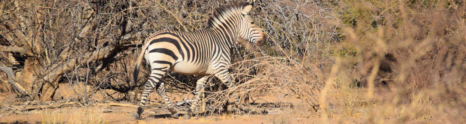 The endemic Hartmann’s Mountain Zebra thrives here in healthy numbers. These hardy animals move in family groups of five to eight, resting on rugged slopes during the day and descending into valleys to graze in the evenings. The tiny Damara Dik-Dik, another endemic species, keeps to the dense undergrowth of dry riverbeds and thorny thickets. Greater Kudu and Gemsbok are common throughout the mountains, while Eland, Leopard, Warthog and Springbok are also regularly encountered. The rocky outcrops provide ideal habitat for Klipspringer, and Duiker and Steenbok are often seen along dry riverbeds and in the valleys. Eland favour the lusher north‑eastern areas, while Giraffe occur in good numbers in the more open southern and western forelands.