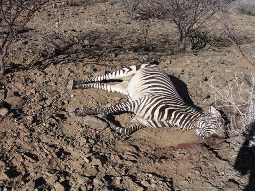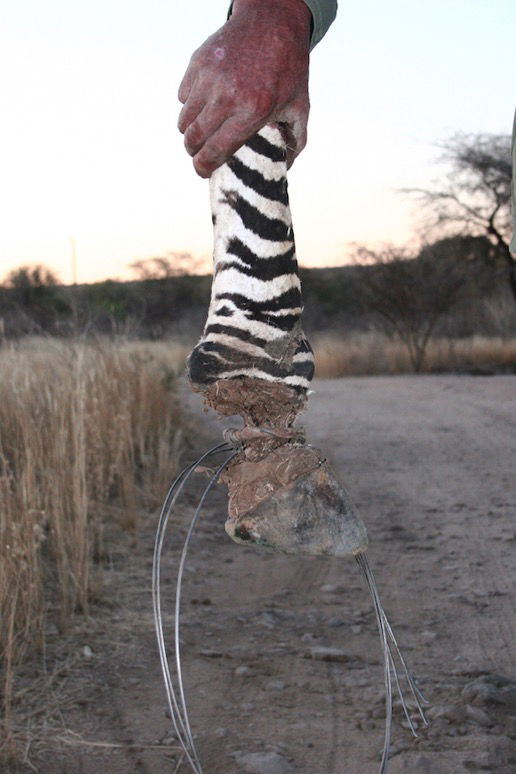 Poachers set steel‑wire snares along game trails, especially near waterholes. Animals such as Hartmann’s Mountain Zebra or Oryx step into the snare, which tightens around the leg, causing immense suffering and often death. Snaring is indiscriminate—multiple animals may be caught at once, and many are left to rot.